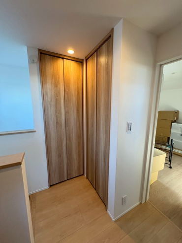 むき出しの収納に扉を新設しました。 ただ扉を付けるだけと、思われるかもしれませんが、これも大変な作業です。 大工さん。クロス屋さん。電気屋さん。 これだけで3業者関わっています。