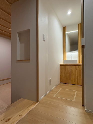 洗面化粧台周りも鏡を取り付け、収納を増やすだけでなく、飾り木材も取り付け、独自のスタイルに仕上がっています